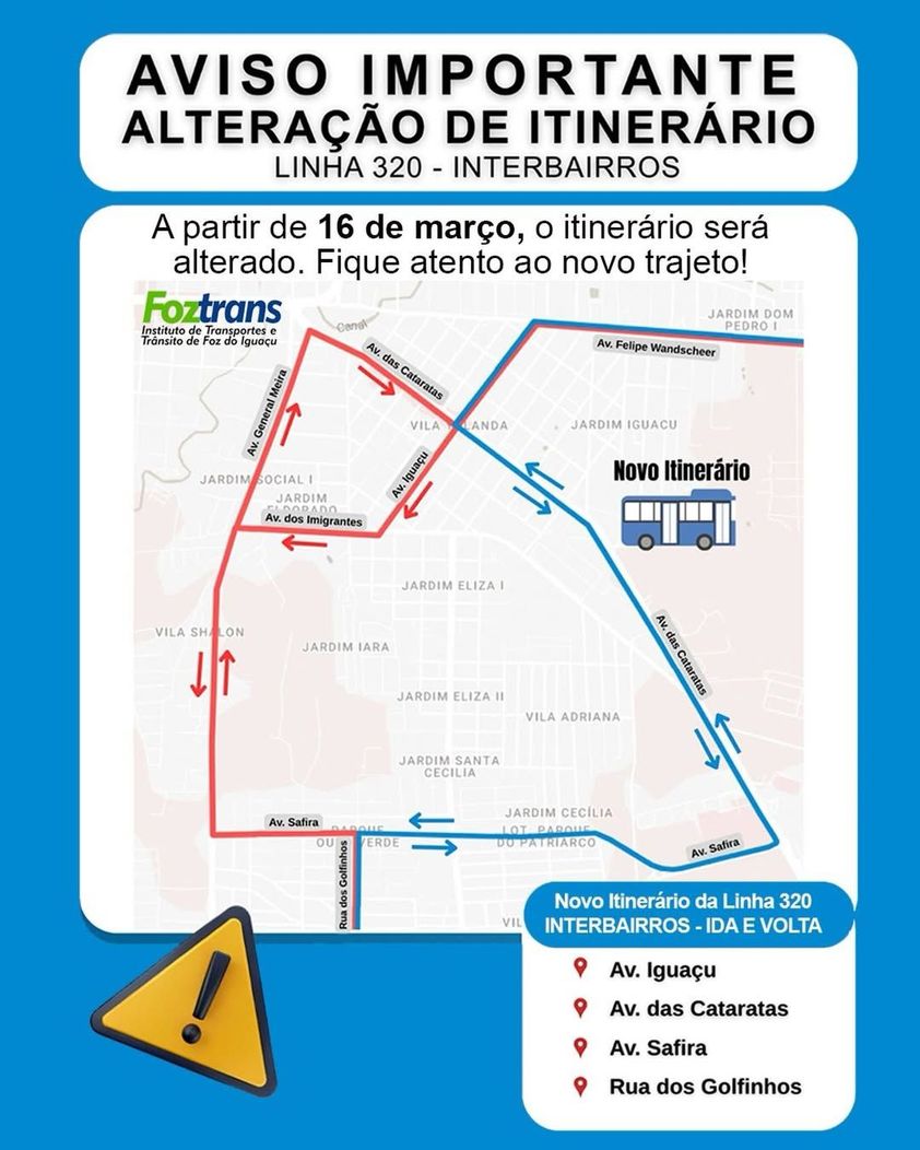 A linha 320 – Interbairros do transporte coletivo de Foz do Iguaçu terá alteração em seu itinerário a partir da próxima segunda-feira (16). A mudança foi anunciada pelo Instituto de Transportes e Trânsito de Foz do Iguaçu (Foztrans) e busca ampliar o atendimento do transporte público e melhorar a distribuição das linhas na cidade.