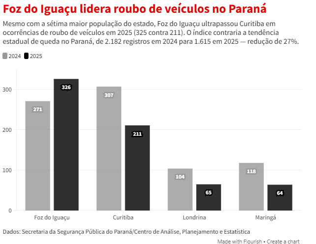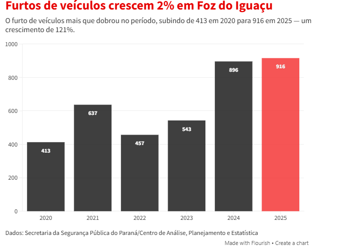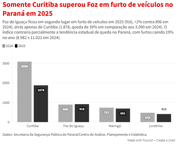 Em 2025, Foz do Iguaçu ficou atrás apenas de Curitiba em furto de veículos no Paraná, com 916 ocorrências (+2% ante 896 em 2024). A capital registrou 1.878 casos, queda de 39% em relação aos 3.090 de 2024.