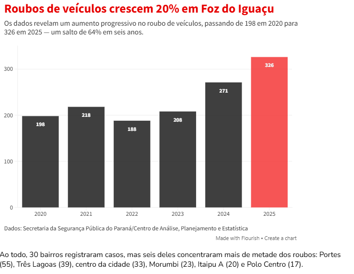 Foz, líder em roubo de veículos no Paraná Esse é apenas um exemplo de uma realidade alarmante. Quase um veículo por dia foi roubado em Foz do Iguaçu ao longo de 2025. O número saltou de 271 ocorrências em 2024 para 325, o que representa um aumento de 20%. Trata-se do maior índice desde 2020, quando iniciou a série histórica do Centro de Análise, Planejamento e Estatística (CAPE), da Secretaria de Estado da Segurança Pública do Paraná (SESP).