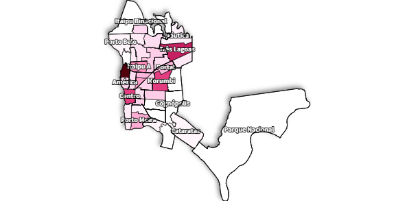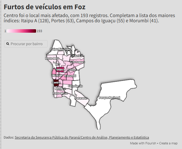 Nesse tipo de infração, o centro dispara como a área mais insegura, liderando o ranking com 193 furtos. A lista dos bairros mais afetados que juntos somam 53% de todos os casos da cidade segue com Itaipu A (128), Portes (63), Campos do Iguaçu (55) e Morumbi (41).