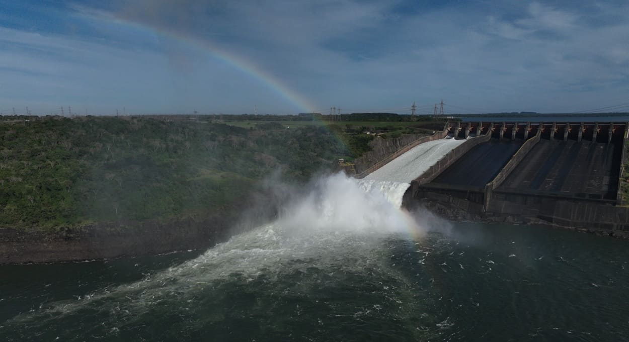 Itaipu Binacional abriu, às 7h deste domingo (9), uma das três calhas do vertedouro da barragem localizada no Rio Paraná, entre Brasil e Paraguai.