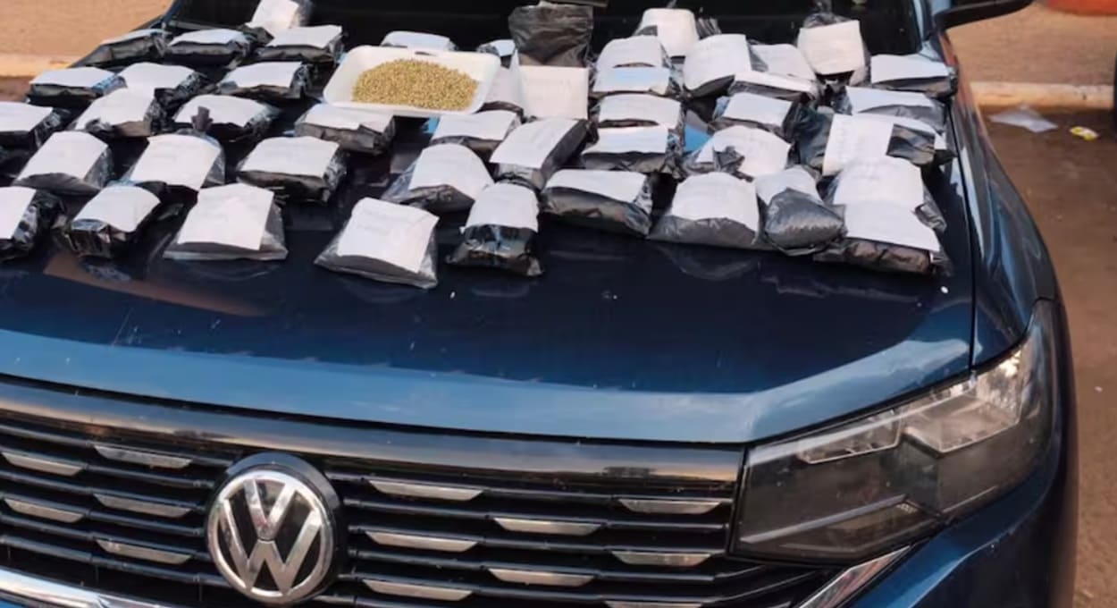 Em fundos falsos no motor e no interior do automóvel, foram encontradas 50 bolsas plásticas contendo itens proibidos na Argentina.